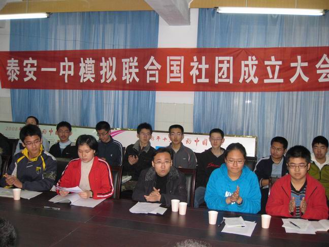 泰安一中模拟联合国学生社团举行成立仪式暨第一次模联活动 2009年3月21日,泰安一中模拟联合国学生社团在泰安一中团校召开了成立大会,会议由高一学生会主席封蔚然同学主持。模拟联合国学生社团团长代表社团成员宣读了社团宗旨、章程、活动计划。李秀笃副校长、张玉良副主任到会表示了热烈祝贺。成立仪式结束后,模拟联合国学生社团开展了第一次活动,活动的议题是“联合国千年计划之环境保护”。指导教师刘元国老师对活动作了有针对性的指导和点评。